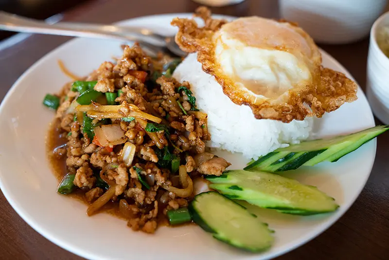 タイ料理といえばこれ!肉とバジルを炒めた『ガパオ』。ひき肉と野菜のスパイシーな香りが食欲を掻き立てます!パリパリの目玉焼きもうれしい!