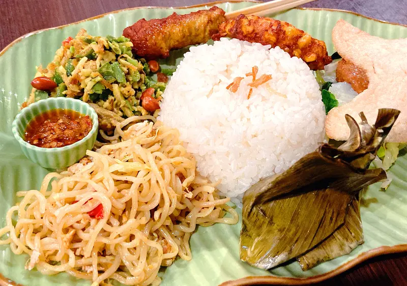 インドネシアの色々なお惣菜が味わえるランチプレート。初めての方はまずこちらを頼んでみるのがおすすめ!それぞれ南国のスパイスが効いた食べやすいお味です。