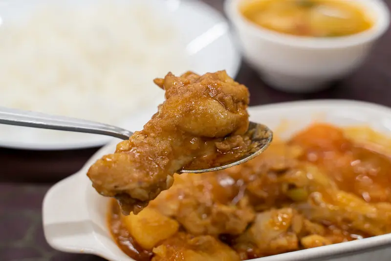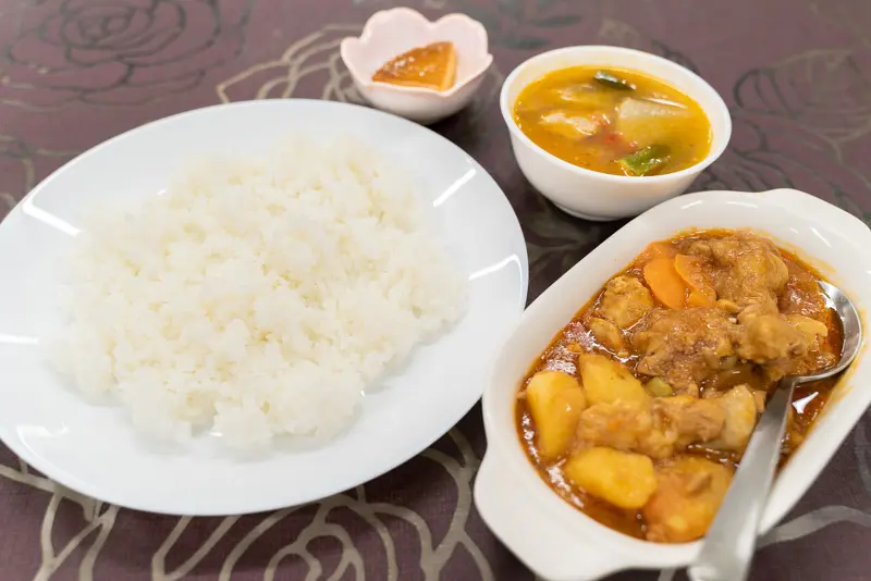 柔らかい具材とソースで ごはんがすすむ!セットのスープは酸味があって、日本では味わえないような珍しい味が楽しめます。