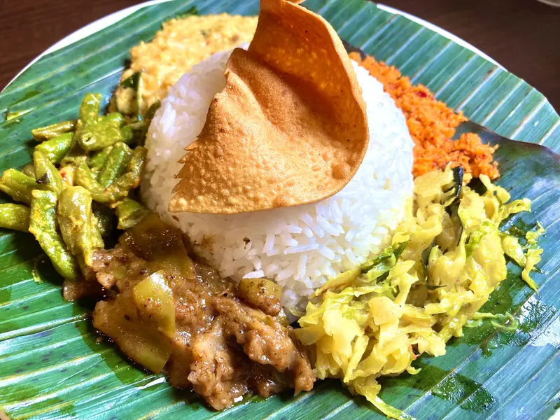 こちらは看板メニューの『ランプライス』。バナナリーフの上にライスと選んだカレー、数種類の惣菜が盛られた形で提供されます。これぞスリランカ!