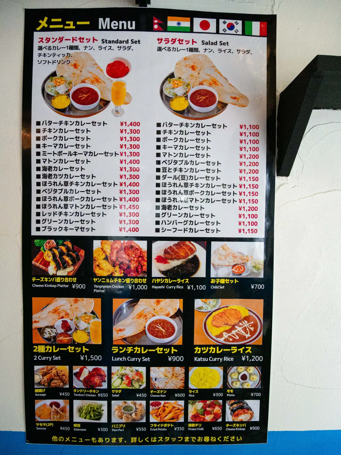 メニューを見るとカレー中心のラインナップですが、下には「他のメニューもあります」と記載されており、リクエスト次第でバリエーション豊かな多国籍料理が登場する期待感があります。ひとつのお店でさまざまな国の味を楽しめるのは嬉しいポイントです。