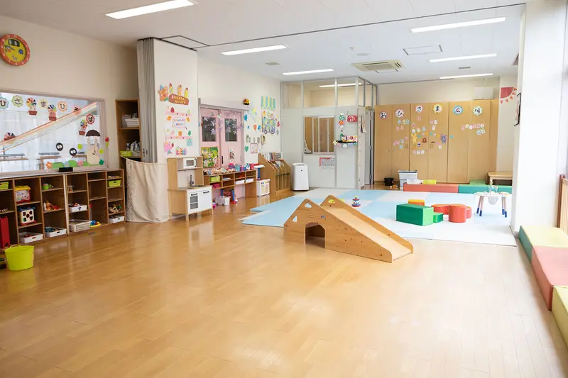 ハイハイ期~元気いっぱいに動き回る子まで楽しめる、すばらしく開放的なスペース。少し離れていても全体を見渡せるので、親としても安心です。