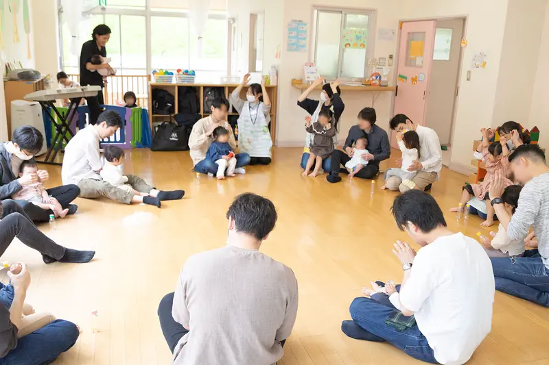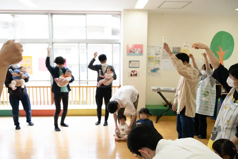 取材日に行われていたのは「パパと遊ぼう」イベント。大勢のパパたちが集まり、子どもと一緒に手遊びや簡単なダンスに挑戦していました。
