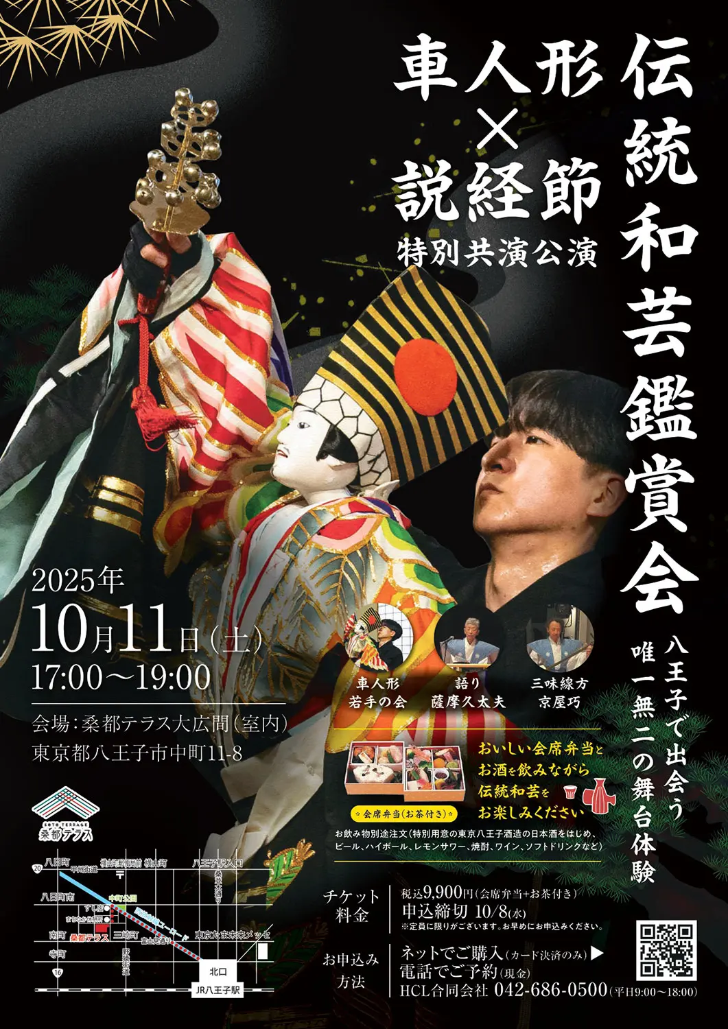 伝統と革新が交わる一夜限りの特別公演が、桑都テラス大広間で開催されます。国の重要無形民俗文化財「車人形」と、語り芸「説経節」による贅沢な共演舞台。八王子で出会える“唯一無二の舞台体験”を、ぜひご堪能ください。