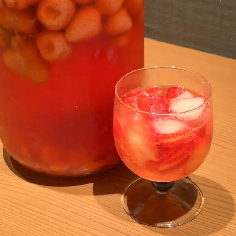 大山の天然水いちごをアルコールに漬け込んで作った特製いちごリキュールをベースに、炭酸を加えた『天然水いちごサワー』。果実の自然な甘みと爽やかな酸味がぎゅっと凝縮された一杯です。途中でグラスの中のいちごを潰すと、さらに濃厚な香りと味わいが楽しめます。