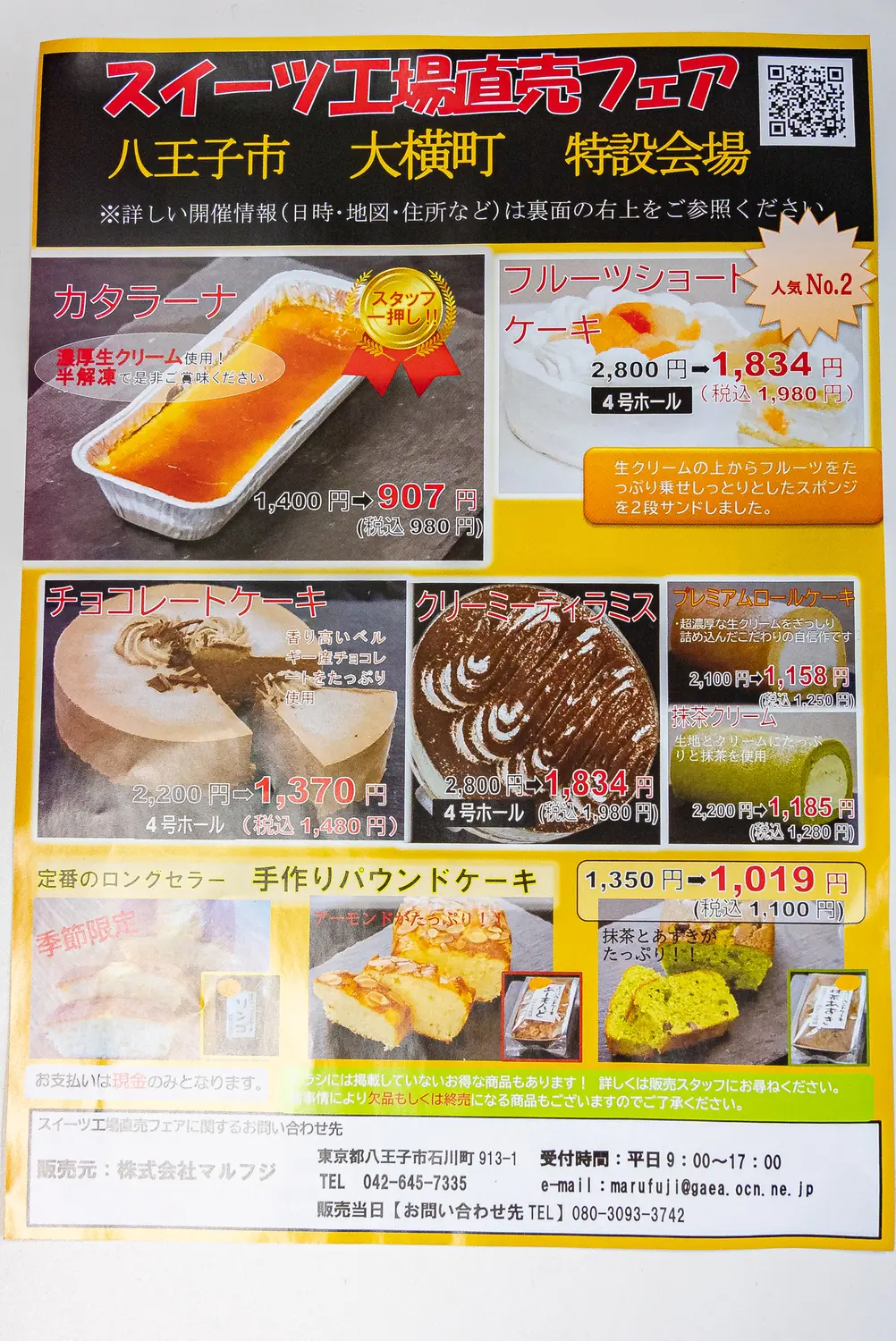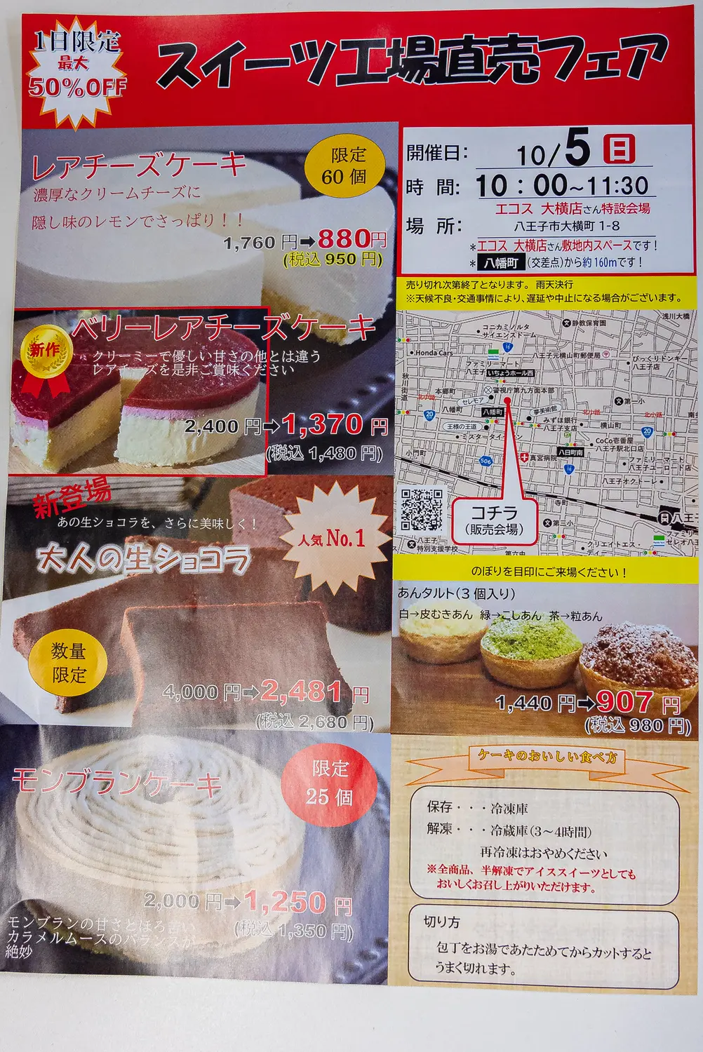 2025年10月5日(日)、八王子市大横町で『スイーツ工場直売フェア』が開催されます。会場はエコス大横店の特設会場、開催時間は10:00〜11:30の90分限定。この日限りの特別価格で多彩なスイーツが登場します。