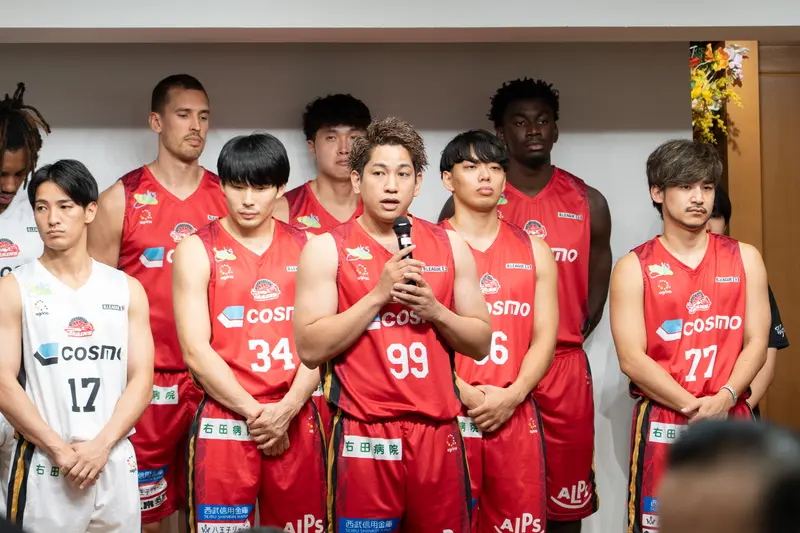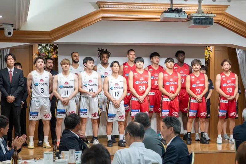 お待ちかねの選手やチアリーダー『Raily’s』の登場です。選手一人ひとりの自己紹介のあと、2年連続でキャプテンを務める大城侑朔選手から、スポンサーへの感謝の言葉と今期にかける思いが語られました。