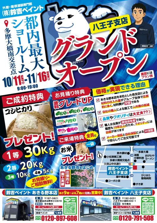 外壁・屋根塗装の専門店「鈴吉ペイント」が、都内最大級のショールームを八王子市に新設!2025年10月11日(土)〜11月16日(日)までの期間、グランドオープンキャンペーンを開催。来場者全員にお米プレゼントや、お見積り・ご成約でグレードアップや豪華特典がもらえる大チャンス!