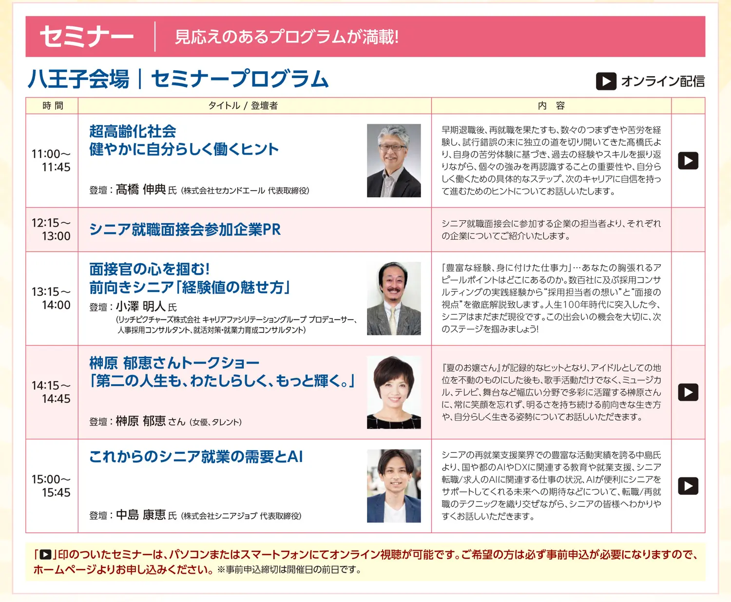 イベントでは、著名人によるトークショーや就業支援セミナー、シニア就業の支援機関による就業相談ブース、シニア向けの健康測定等の様々なプログラムを用意すると共に、合同就職面接会を同時開催いたします。