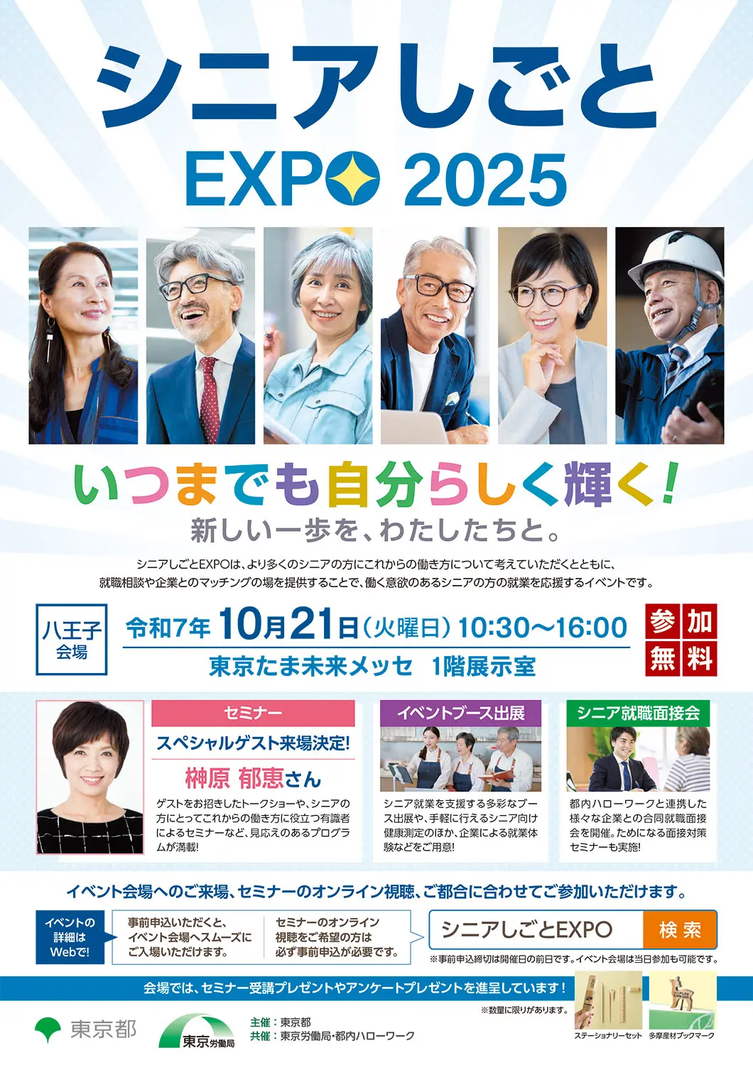 働く意欲のあるシニアを応援する就業支援イベント『シニアしごとEXPO2025』が、2025年10月21日(火)に京王八王子駅すぐの東京たま未来メッセで開催されます。基調講演やトークショー、就職面接会、企業ブースの展示まで充実の内容。すべて無料で参加でき、当日の飛び込み参加もOKです!