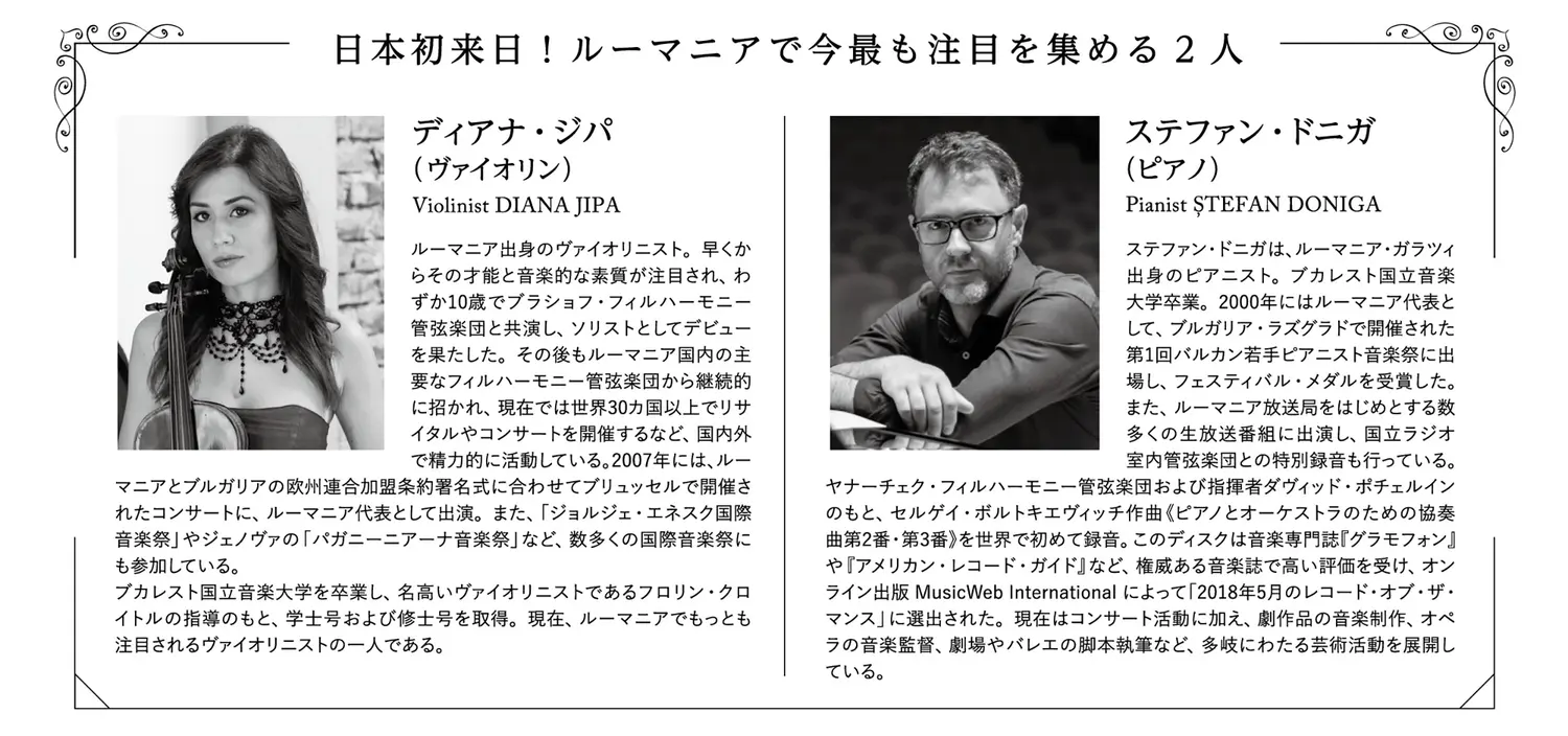 東欧・ルーマニア出身の実力派ヴァイオリニストディアナ・ジパ氏と、ピアニストステファン・ドニガ氏の奏でるハーモニーをぜひ生でご鑑賞ください!