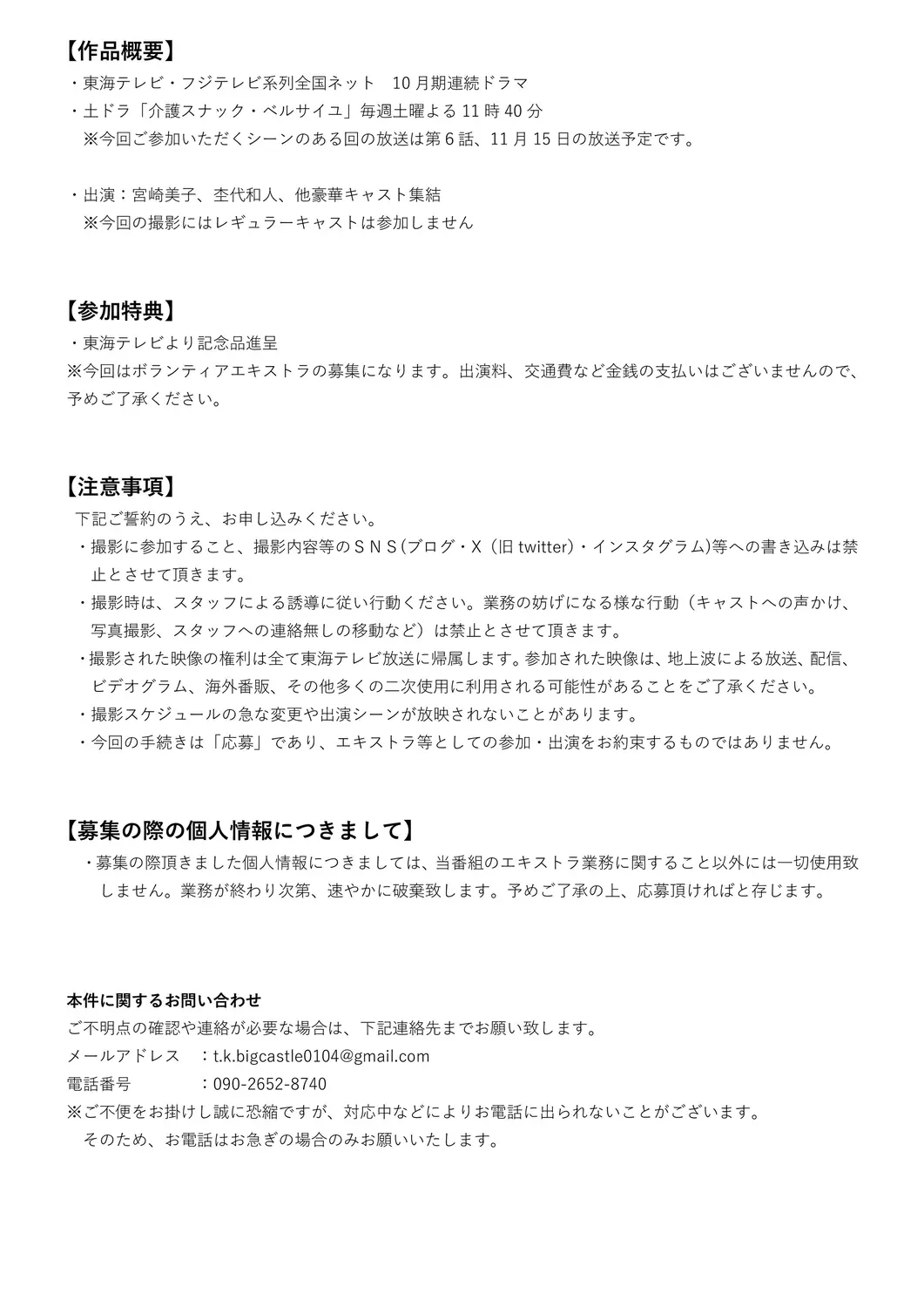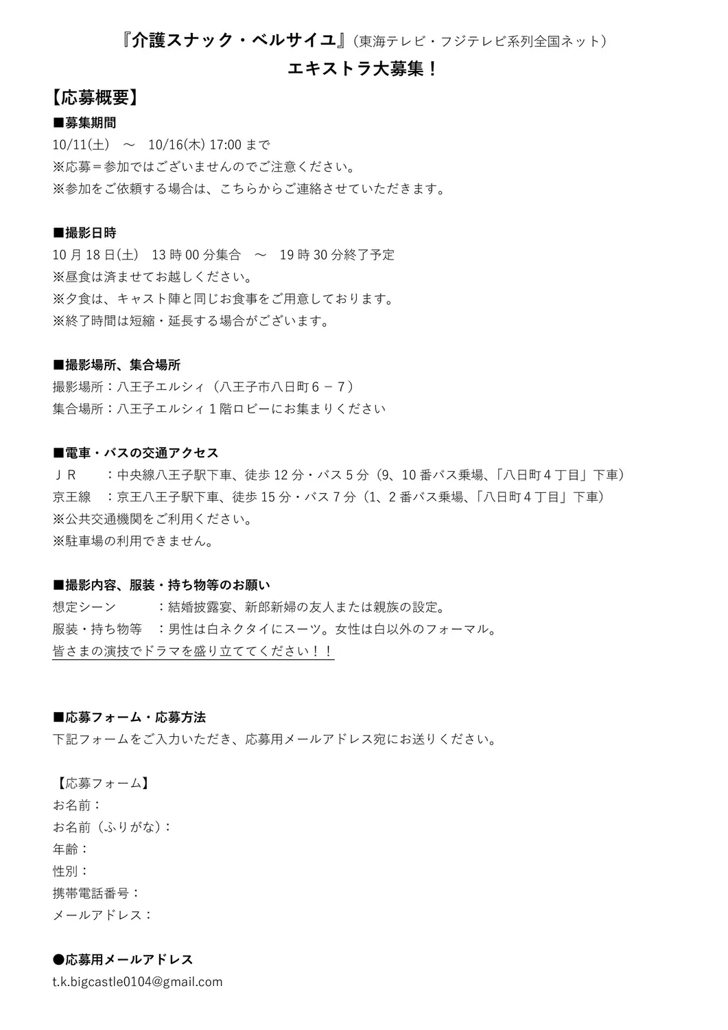 さらに、エキストラの一般募集も実施中です(10月16日(木)17:00締切)。撮影場所は八王子エルシィで、結婚披露宴のシーンに参加できるチャンスです。設定は新郎新婦の友人または親族で、服装の指定があります。男性はスーツに白ネクタイ、女性は白以外のフォーマルスタイルが必須。細かい条件がありますので、応募前に必ず募集要項を確認しましょう。地元八王子での撮影に関われる貴重な機会ですよ!