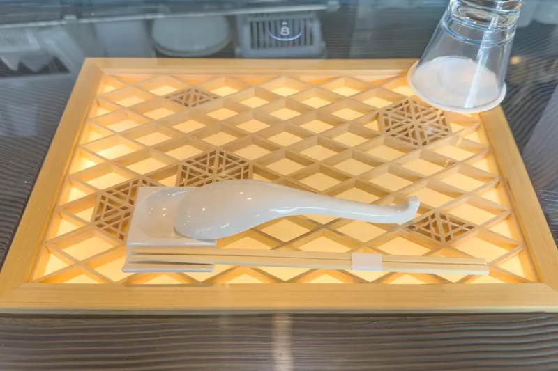 座席はカウンターのみの12席。ガラスで設えたカウンターの中には組子細工が埋め込まれており、店内の和なBGMも相まって、日本料理店に来たような雰囲気が味わえます。