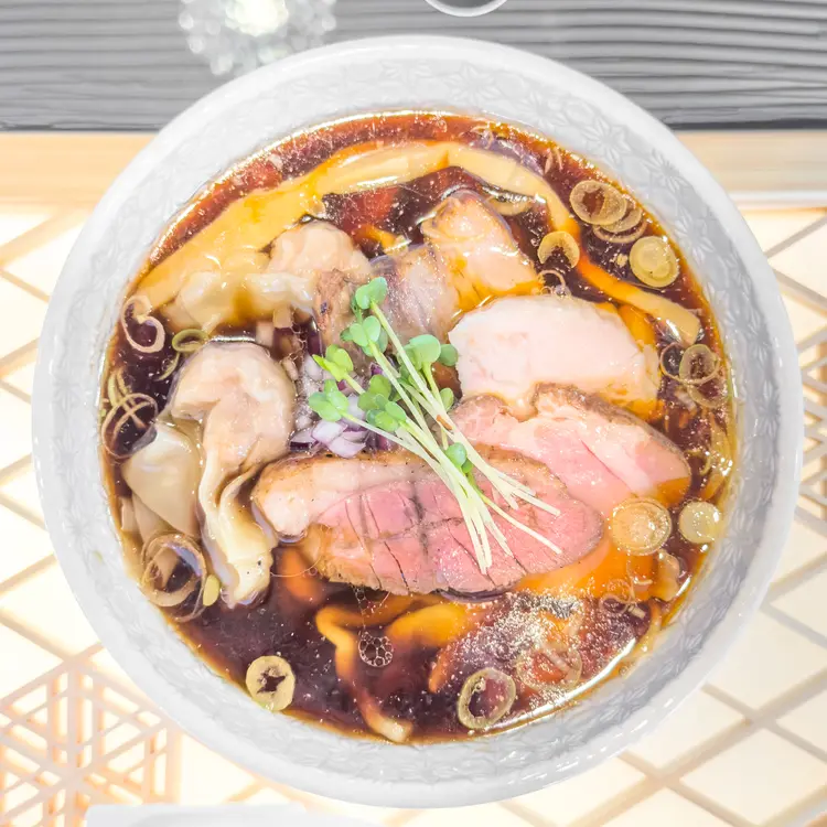 特製にのっているトッピングは炭火で焼いたチャーシュー4種(鴨肉、アーモンドポーク、桜姫鶏のむね肉、イベリコ豚バラ肉の煮豚)、ワンタン(イベリコ豚)2個、メンマ、かいわれ。