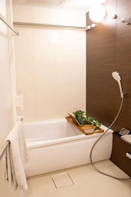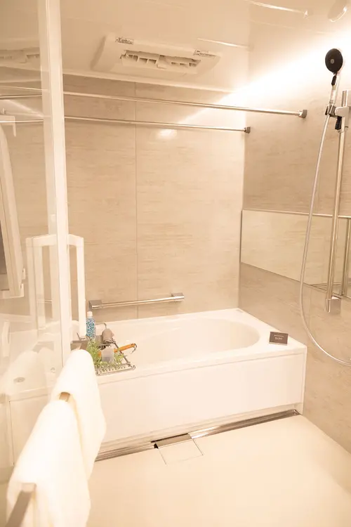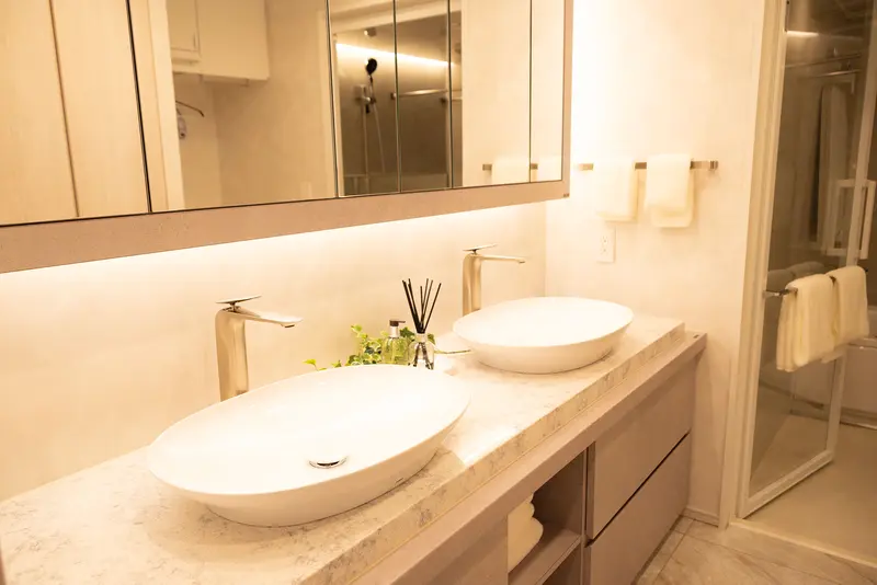 洗面台やバスルームも広々としていて、収納もたっぷり。