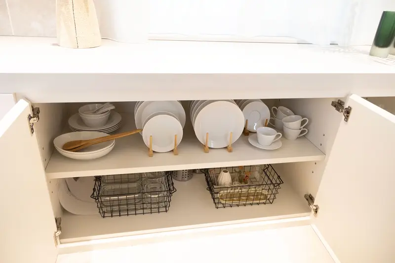 ごちゃついて見えがちの食器類はこの広々した収納で解決!