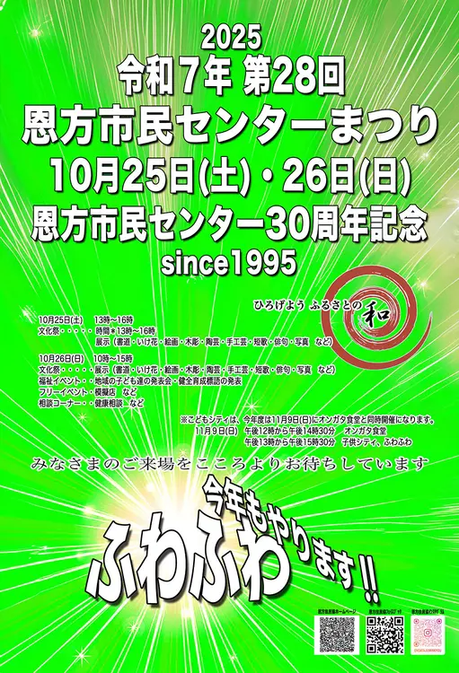 恩方市民センターまつりは、毎年10月に開催。2025年は開館30周年の節目を迎え、地域全体が盛り上がる特別な年に。子どもから大人まで楽しめる展示や発表、模擬店、福祉イベントなど・・・地域が一体となって作り上げる、年に一度のおまつりです。