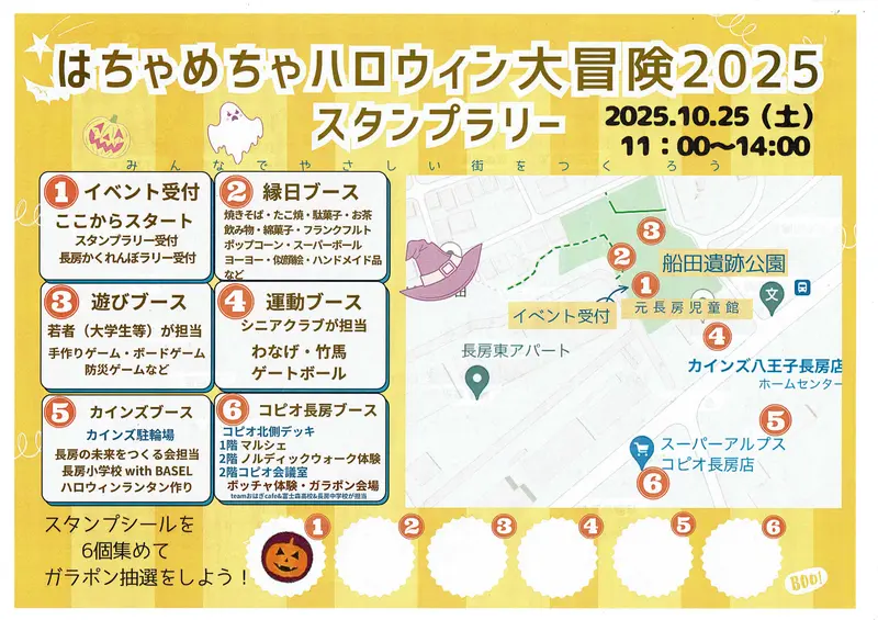 「はちゃめちゃハロウィン大冒険2025」は、10月25日(土)11:00〜14:00に元長房児童館や船田遺跡公園などを会場に開催。スタンプラリーを楽しみながら、縁日・運動・遊び・カインズ・コピオ長房など6つのブースを巡るイベントです。