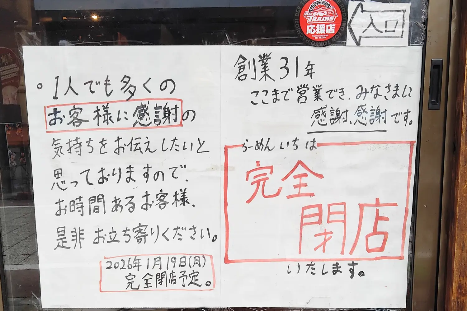 八王子駅南口で31年にわたり愛されてきた老舗ラーメン店『らーめんいち』が、2026年1月19日に閉店します。1人でも多くの方に味わってもらいたいとの思いから、早めの告知となりました。