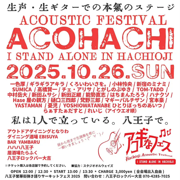 八王子のライブバーや飲食店を会場に、アコースティック音楽が響く1日イベント『アコハチ(Hachioji Acoustic Festival)』が2025年10月26日(日)に開催されます。生声・生ギターで本気のステージを楽しめる、八王子らしい音楽フェスです。