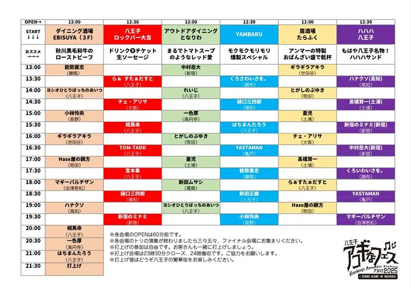 おいしいお酒や料理とともにアコースティックの生演奏を楽しめるなんて、本当に素敵ですね。お店ごとに雰囲気も違うから、はしごしながら聴き比べるのも楽しそう。秋の八王子で、音と人と街がつながる一日になりそうです!