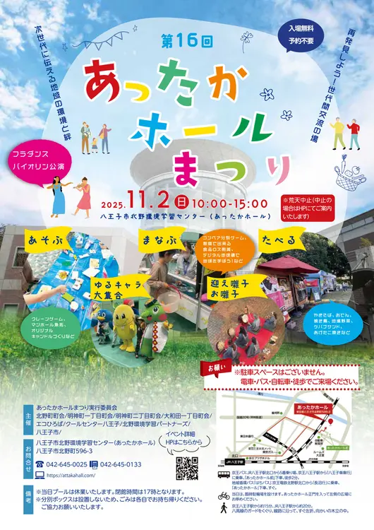 「次世代に伝える地域の環境と絆」をテーマにした『あったかホールまつり』。体験や展示で楽しく遊びながら、八王子の魅力や環境について再発見できる1日になりそうですね。世代を越えて交流できる“あったか”なイベント、ぜひ足を運んでみてください!