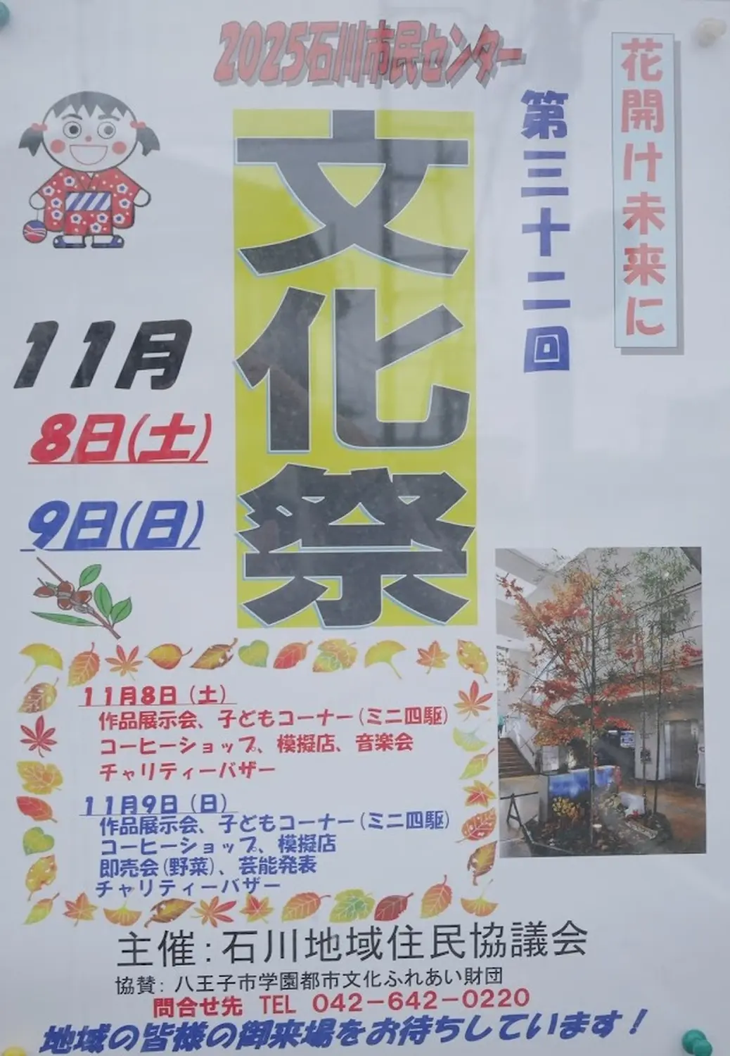 地域の方々による展示や発表が行われる『第32回石川市民センター文化祭』が、2025年11月8日(土)・9日(日)に開催されます。今年のテーマは「花開け未来に」。長年親しまれてきたこの文化祭は、地域のつながりを感じられる秋の風物詩といえますね。