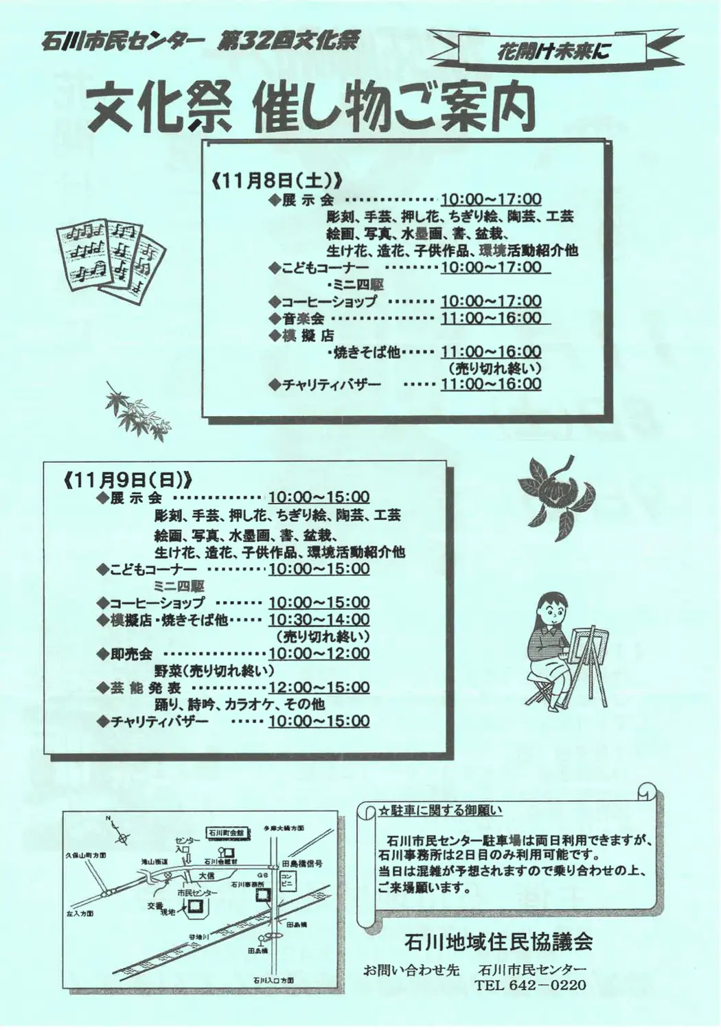 石川市民センター駐車場は両日利用可能ですが、石川事務所の駐車場は2日目のみ開放されます。混雑が予想されるので、来場の際は乗り合わせや公共交通機関を利用して訪れましょう!