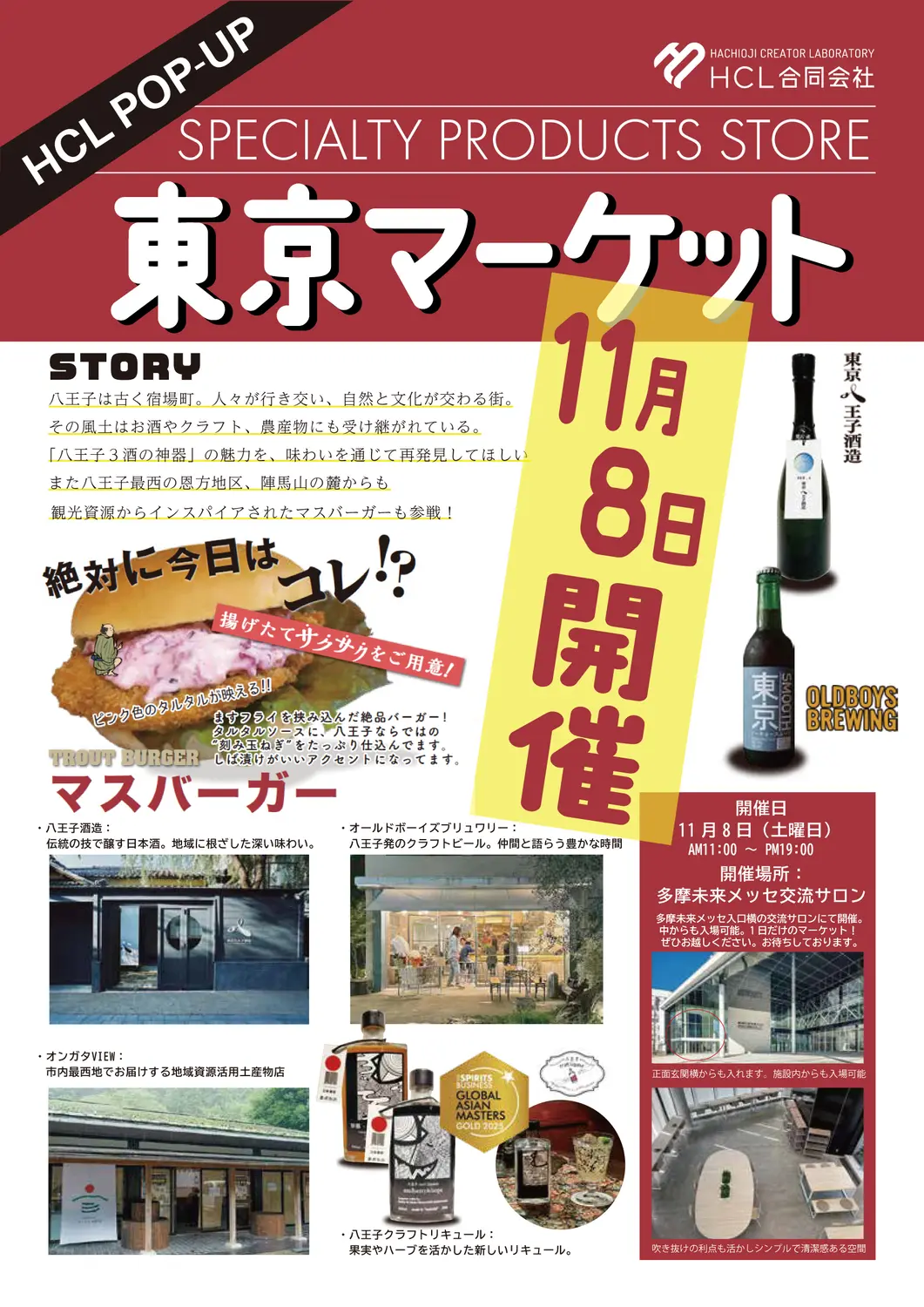 八王子の“伝統”と“いま”が交わる1日限定マーケット、『東京マーケット』を東京たま未来メッセの交流サロンで開催。日本酒・クラフトビール・クラフトリキュールに、恩方発のご当地グルメ「マスバーガー」や地域資源を活かした土産物まで、八王子の“味”と“ものづくり”が一堂に集まります。