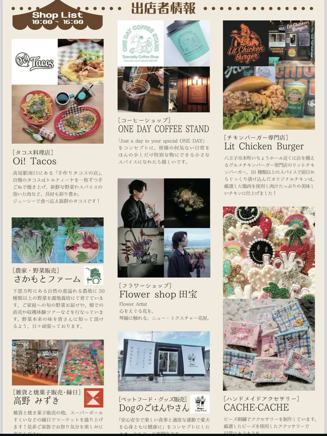 当日は10月に惜しまれつつ閉店した『oi!Tacos』など、高尾ゆかりのお店がズラリと並びます。子どもも楽しめる縁日や、八王子産野菜・ハンドメイド販売など、家族みんなで楽しめる内容です。