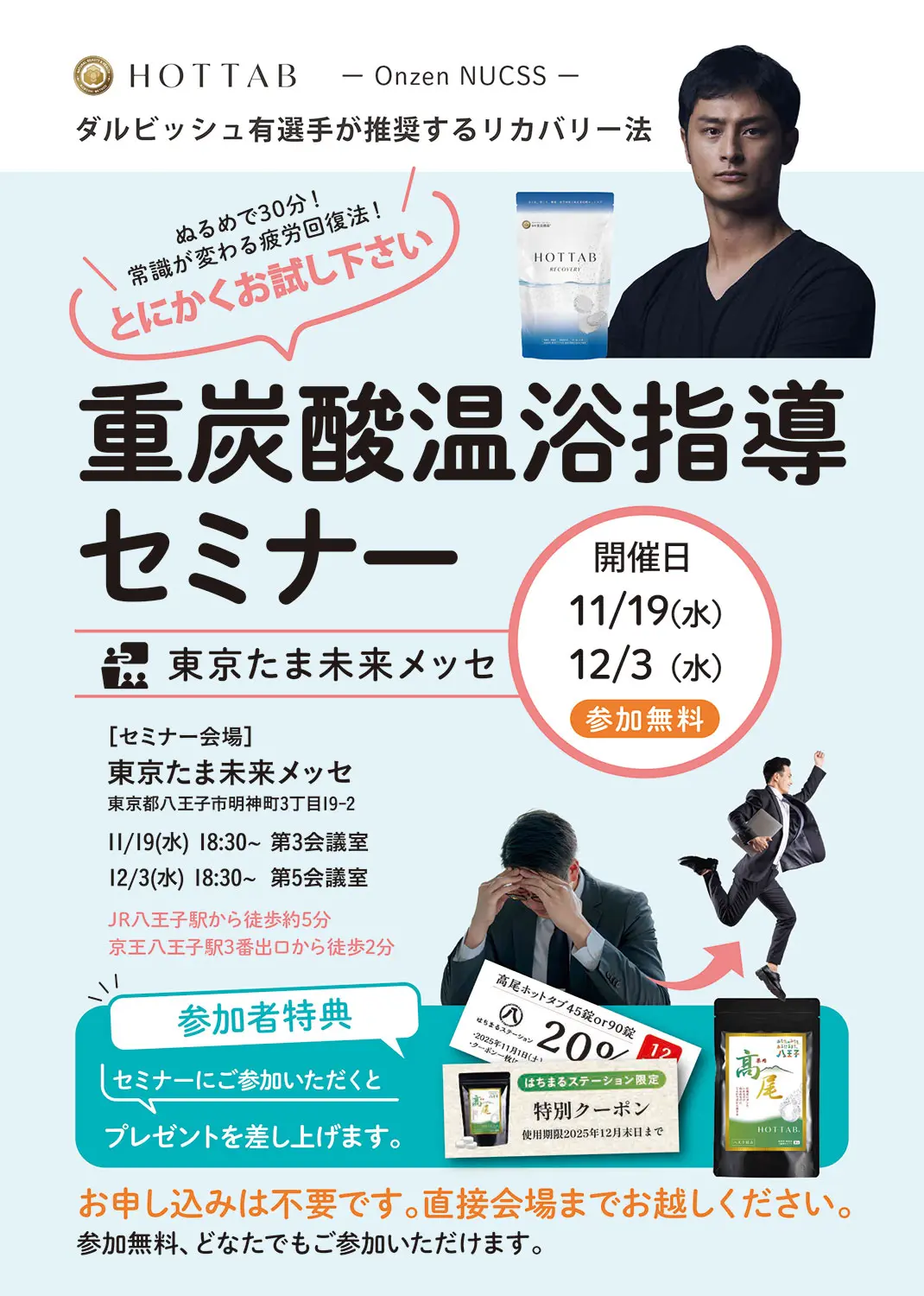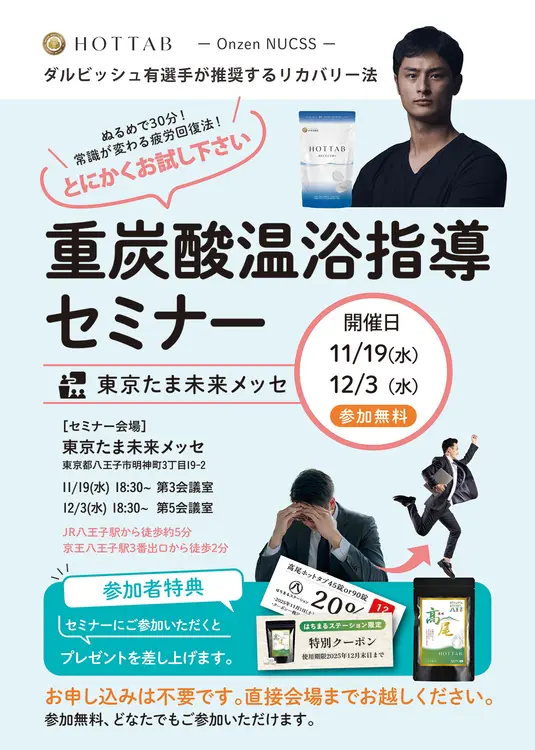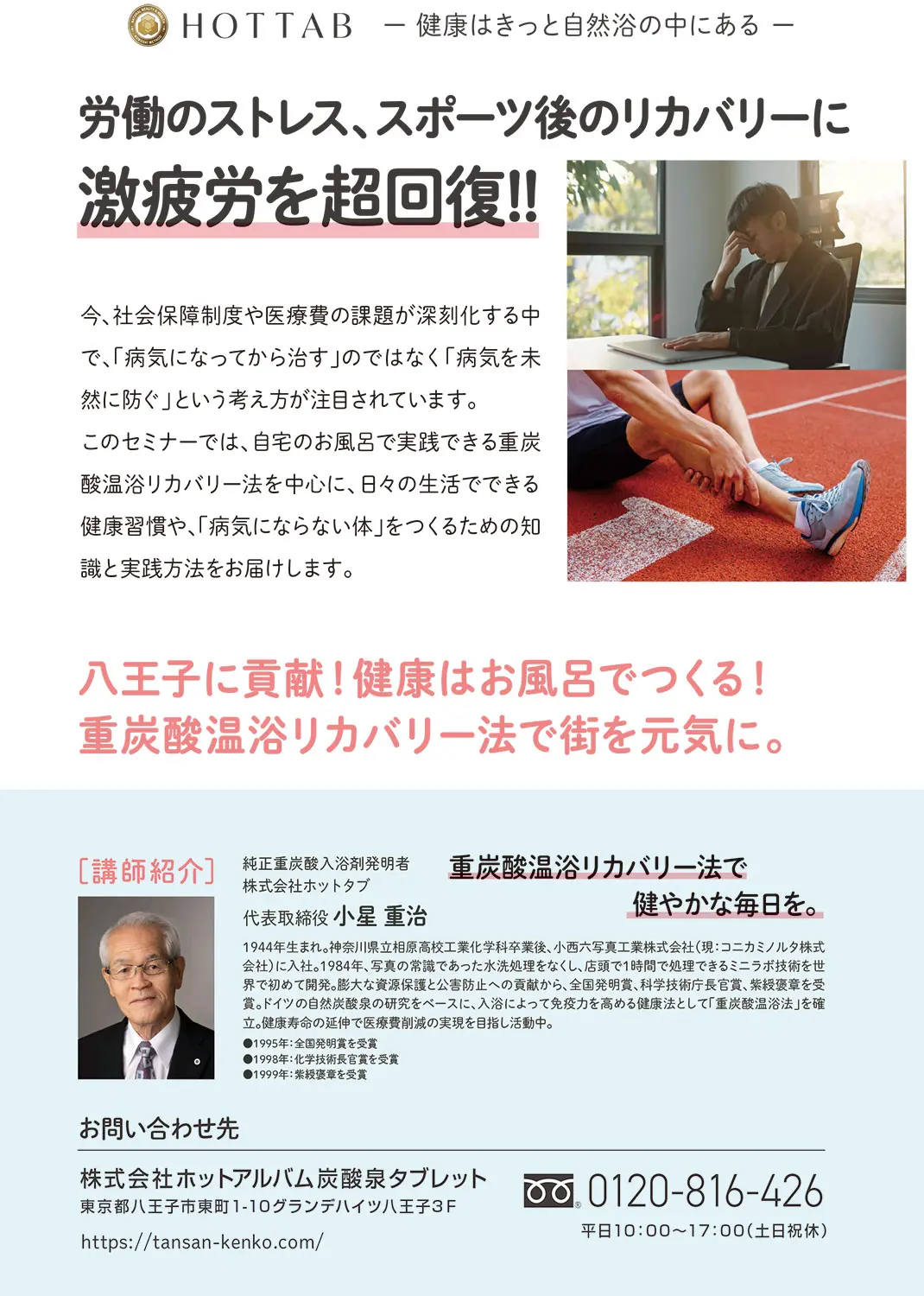 株式会社ホットアルバム重炭酸泉タブレット(本社:八王子市東町)は、どなたでも参加できる重炭酸温浴指導健康セミナー(参加無料)を開催いたします。