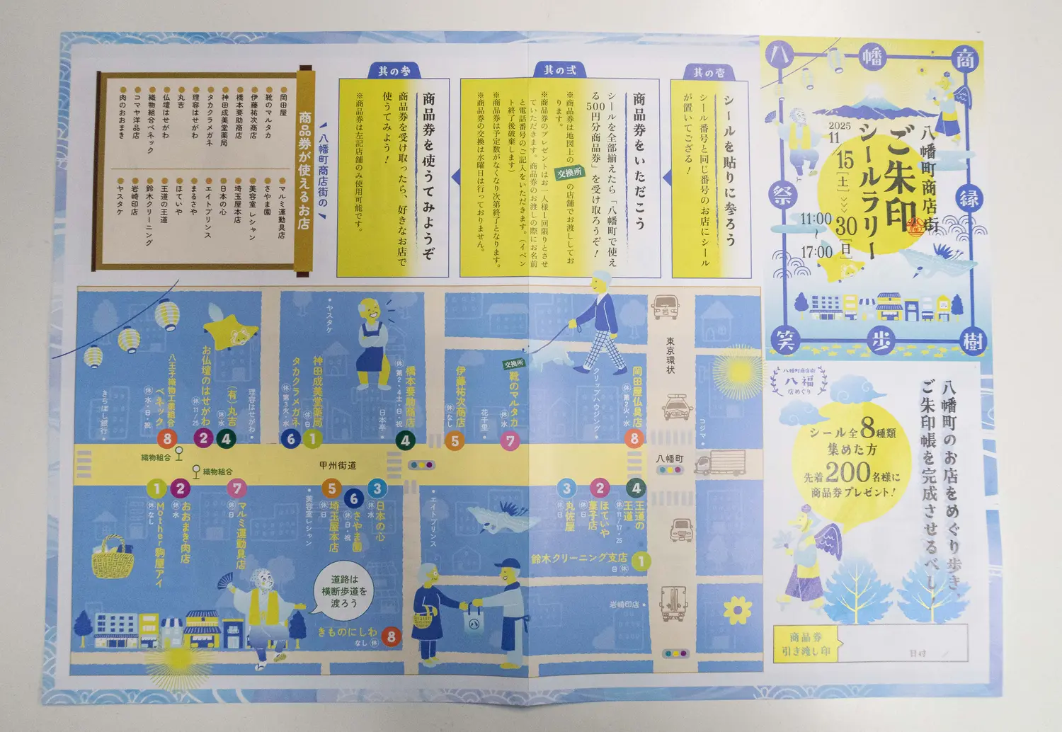 八王子・八幡町商店街で『御朱印シールラリー』を開催中!商店街を巡って8種類のシールを集めると、先着200名に500円分の商品券をプレゼント。参加は無料で、台紙は各店舗で配布中。歩きながら地元の魅力を楽しめる期間限定イベントです。