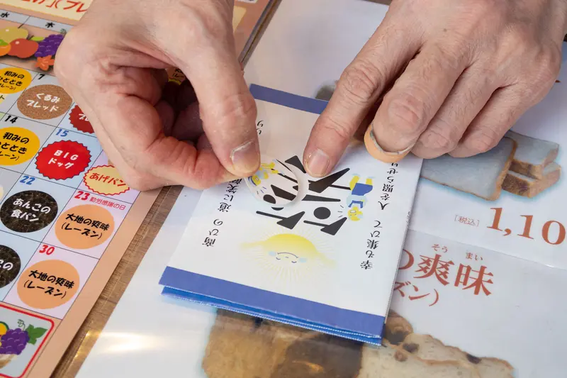 店舗ではスタッフさんが丁寧に対応してくれ、自分で貼るシステムのところもあれば、お店の方が貼ってくれる場合も。商店街のあたたかさを感じられるひとときです。