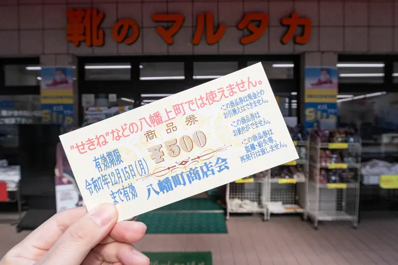 完成した台紙を持って、8番シールを担当する『靴のマルタカ』へ行くと500円の商品券と交換してもらえます。