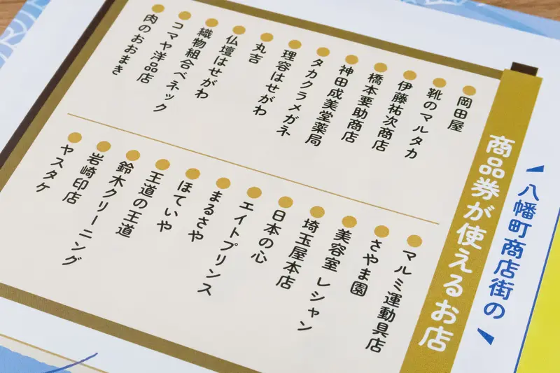 商品券は八幡町商店街の対象店舗で利用でき、食品から日用品まで幅広く活用できます。老舗や専門店も多く、目的に合わせて便利に使えるのがうれしいポイントです。