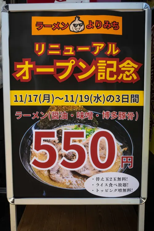 店頭の看板には、11/17からの3日間限定で『醤油』・『味噌』・『博多豚骨』が550円になるリニューアル価格を掲示。さらに、既存の「替え玉2玉無料」「ライス食べ放題」「トッピング増無料」などの太っ腹サービスもそのままです。