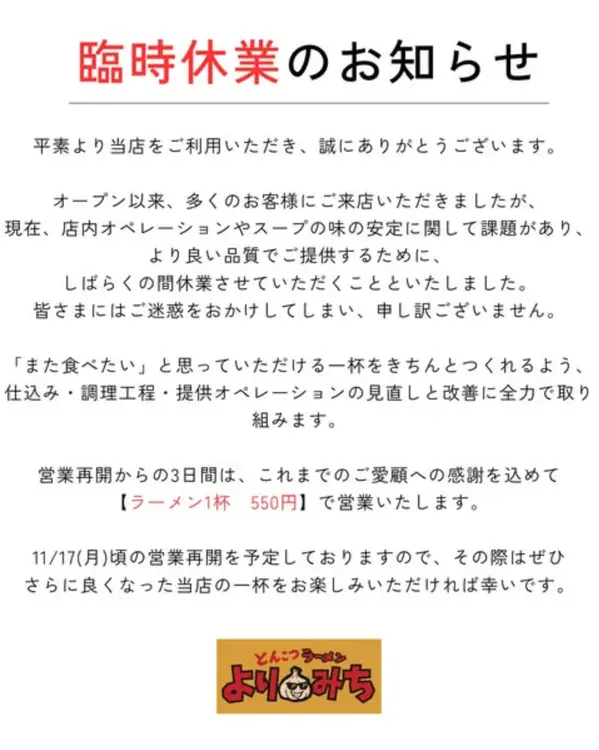 投稿内容によると、“また食べたいと思ってもらえる一杯”を届けるため、仕込み・調理工程・提供オペレーションの見直しを行うとのこと。品質向上を目的とした休業で、再開後3日間はリニューアルオープン記念としてラーメン1杯550円で提供する旨が案内されていました。
