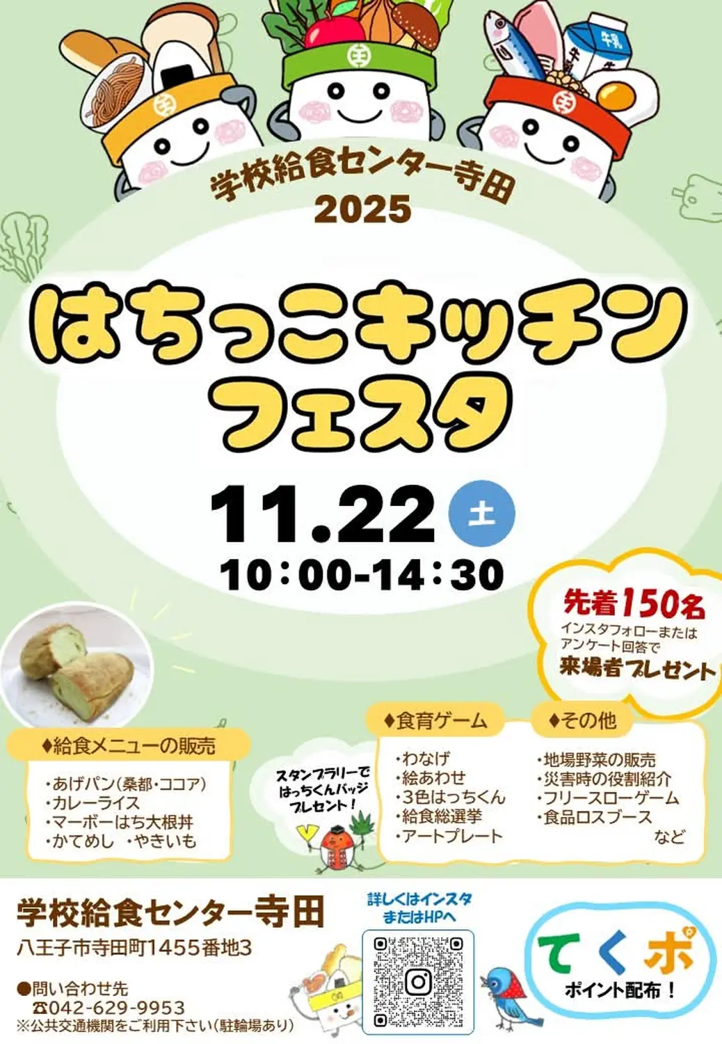 給食センターの食育イベント『はちっこキッチンフェスタ in 寺田』が、『給食センター寺田』で2025年11月22日(土)に開催されます。学校給食で人気のメニューの販売、給食で使用している地場野菜の販売、食育ゲームなど、子どもから大人まで楽しめる企画が盛りだくさんです。
