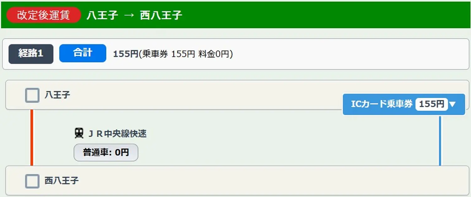 例として、八王子駅から西八王子駅までの改定後運賃を調べました。ICカード利用で改定前は146円ですが、改定後は155円と9円の値上げとなります。