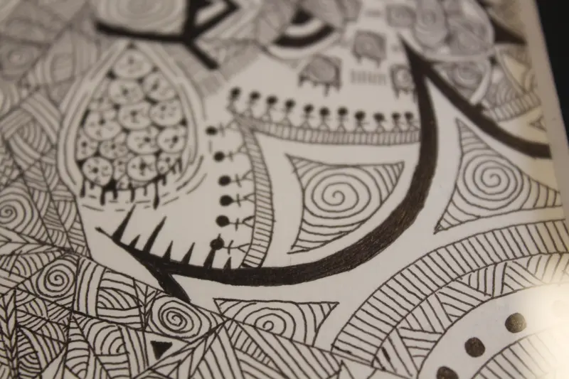 「そうです。例えば、渦巻を描くのはストレスの解消になるんだそうです。小魚の群や、人の姿、血が流れているようなのもあります。本⼈の⼼の中のイメージなんでしょう。ここなんかは、たくさんの人がいる中で一人(本人)にだけ大きなトゲのようなものが刺さっています。