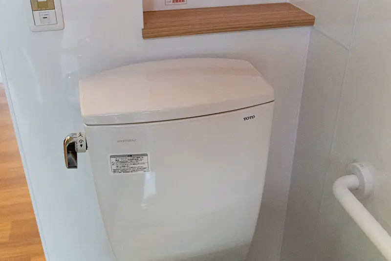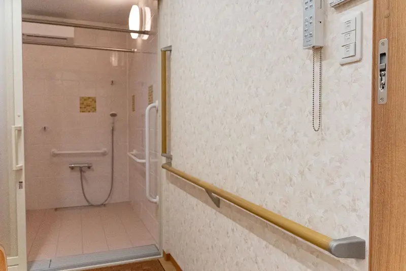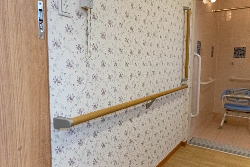 館内の設備には、長年の介護現場での経験から生まれた「使う人目線」の工夫が満載です。例えばトイレ。半身麻痺の方が無理な姿勢にならずにレバーを操作できるよう、部屋によってレバーの位置が左右逆に取り付けられています。必ず手前側にレバーが来るようになっていて、奥まで手を伸ばさなくていいようになっています。