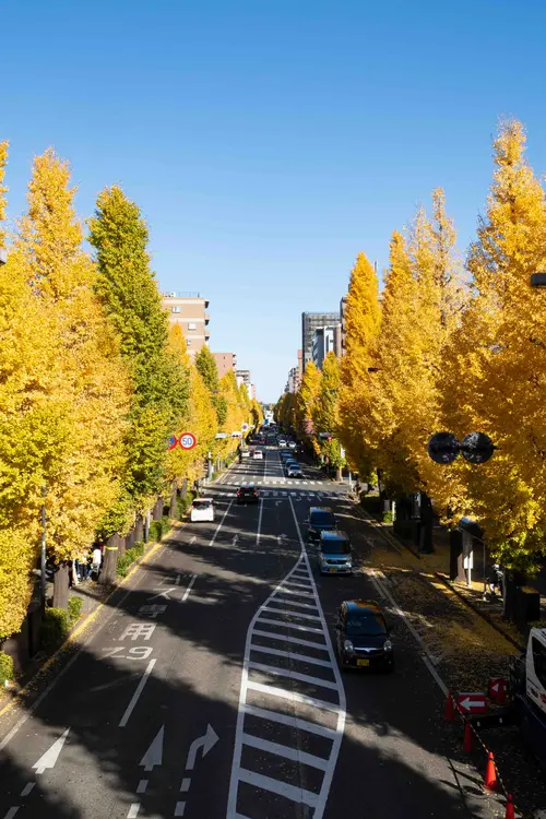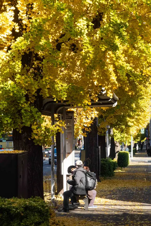 イチョウのトンネルの中では、バス待ちの人々さえ絵になります。普段の生活シーンが少し特別に見えるのも、この時期ならでは。