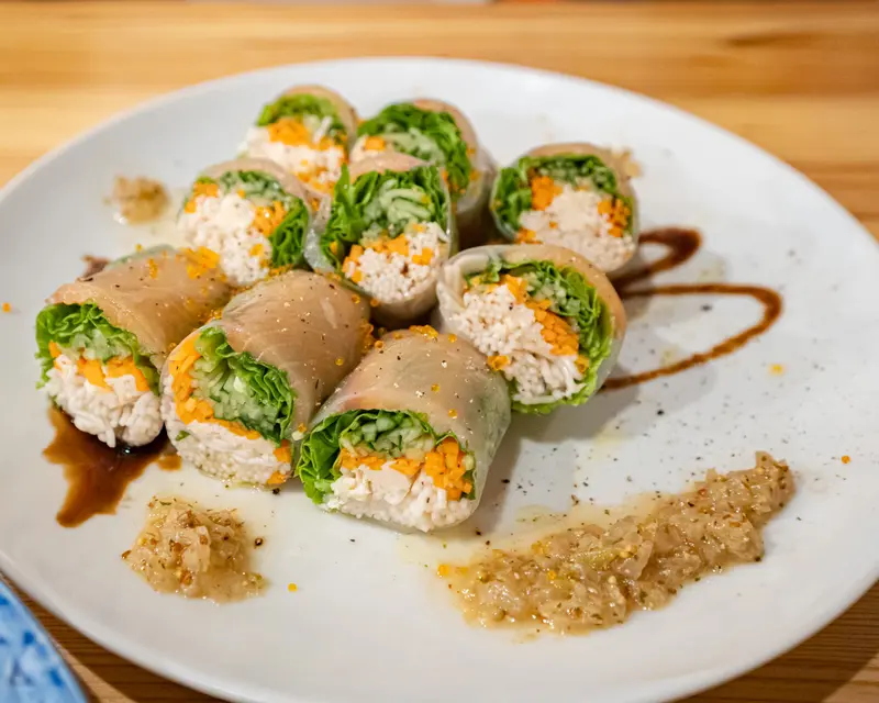 レタス、きゅうり、にんじん、ソーメンを生春巻きのようにスモークサーモンで巻いた一品。生野菜などのシャキシャキ感とサーモンのなめらかな舌触りで食感のコントラストが楽しめます。一般的にコースの序盤はサラダが出ることが多いですが、手軽に食べられる”一口サラダ”は嬉しいですね。