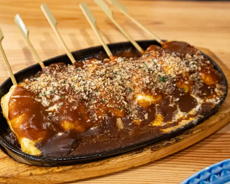 名前のとおり一般的に豚肉を使うことが多い「豚平(とんぺい)焼き」ですが、このコースの豚平焼きには、なんと牛タンが使われています。さらにビーフシチューがかかったスペシャル版。串になっていて取り分けしやすいのが高ポイント。