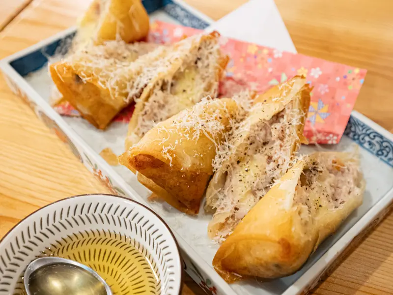 中にキノコとチーズがたっぷり入った揚げ春巻き。これだけでもおいしいですが、添えられたはちみつをかけることで「甘じょっぱい」おつまみに変身!