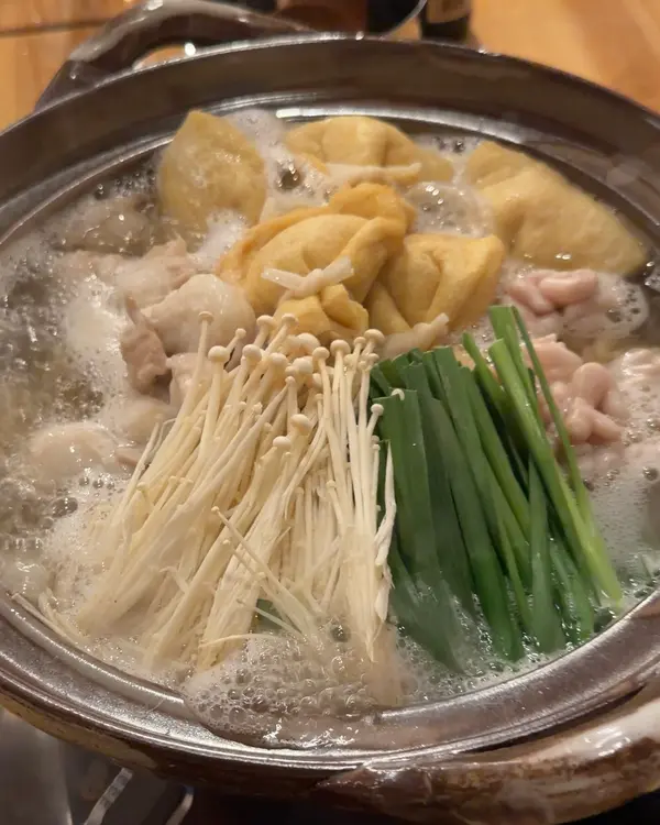最後は煮干しをたっぷり使って作った塩スープがおいしい和牛モツ鍋です。ぷりっぷりのモツはもちろん、一般的に必須具材ではない白子や餅入れ巾着まで入ったスペシャル版。具がしっかり温まったら玉ねぎスライスと岩海苔をたっぷり入れていただきます。塩スープにさまざまな食材の旨みが溶け出し、味わい深い鍋になっていきます。〆にはちゃんぽん麺。塩煮干しスープを最後まで堪能しました。
