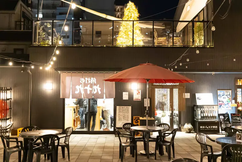 八王子駅北口から徒歩7分。歴史ある花街エリアにある桑都テラス内、その一角に『角打ち 九十九』があります。店名の通り立ち飲みができる気軽さが魅力で、夜はテラス全体がイルミネーションに包まれて雰囲気も抜群です。