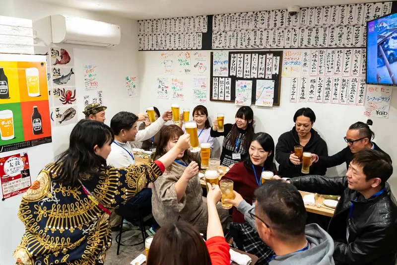 かんぱ〜い!!八王子・桑都テラス内の『角打ち 九十九(つくも)』で、八王子・相模原ジャーニーのライター懇親会を開催しました!花街の落ち着いた雰囲気の中、全12品のボリューム満点な宴会コースを満喫。当日のようすをぎゅっとまとめてお届けします。