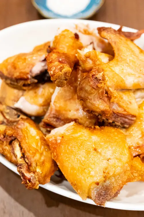 『九十九』といえば外せないのが、この若鶏の半身揚げ。皮はパリッ、中は驚くほどジューシー。塩だけでいただくシンプルさなのに、噛むほどにおいしさが押し寄せてきます。存在感もボリュームも申し分なし!
