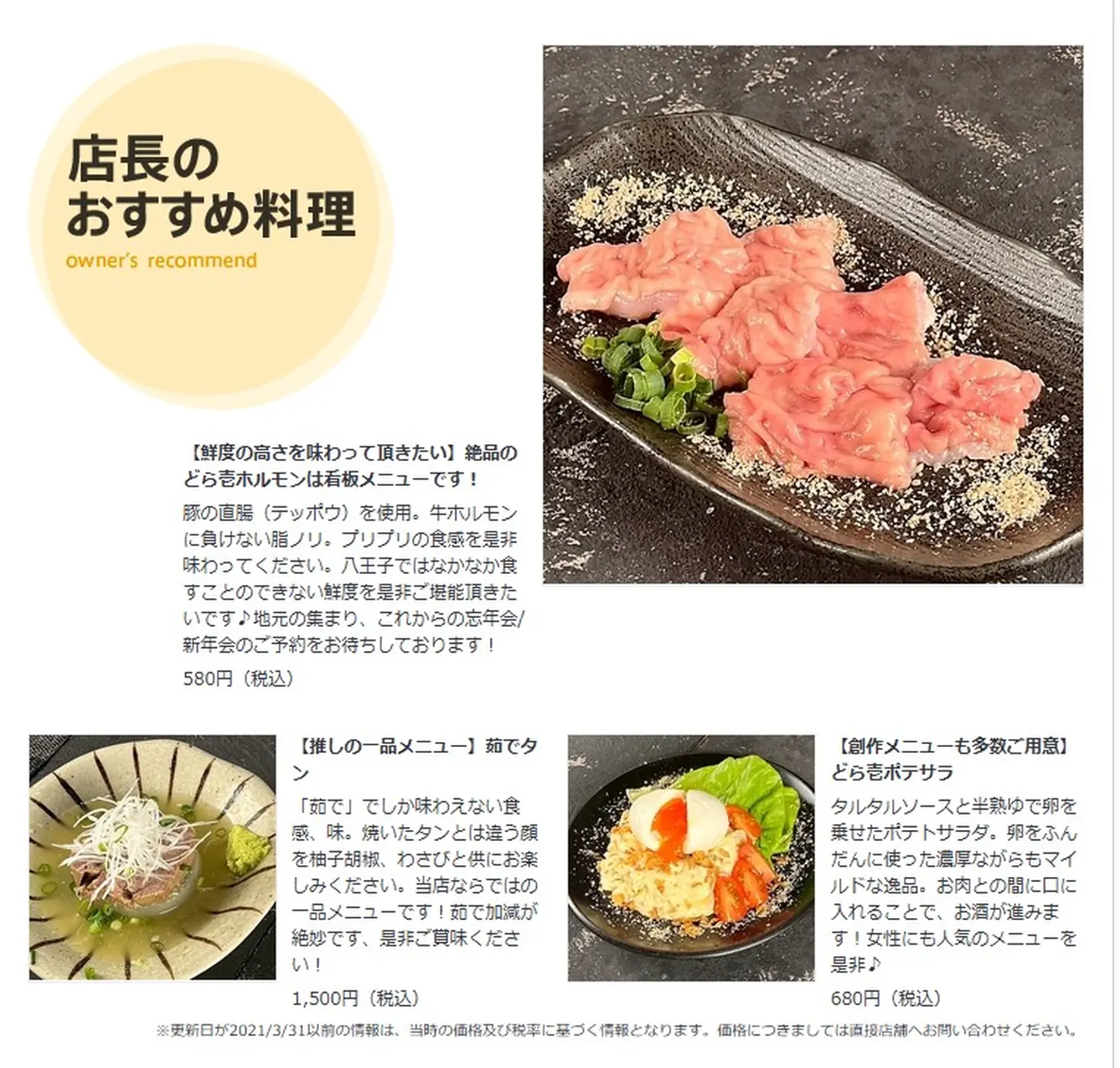看板メニューの『どら壱ホルモン』は豚の直腸(テッポウ)を使用。牛ホルモンに負けない脂ノリとプリプリの食感を楽しめるとのことで、ホルモン好きにはたまらない内容ですね。